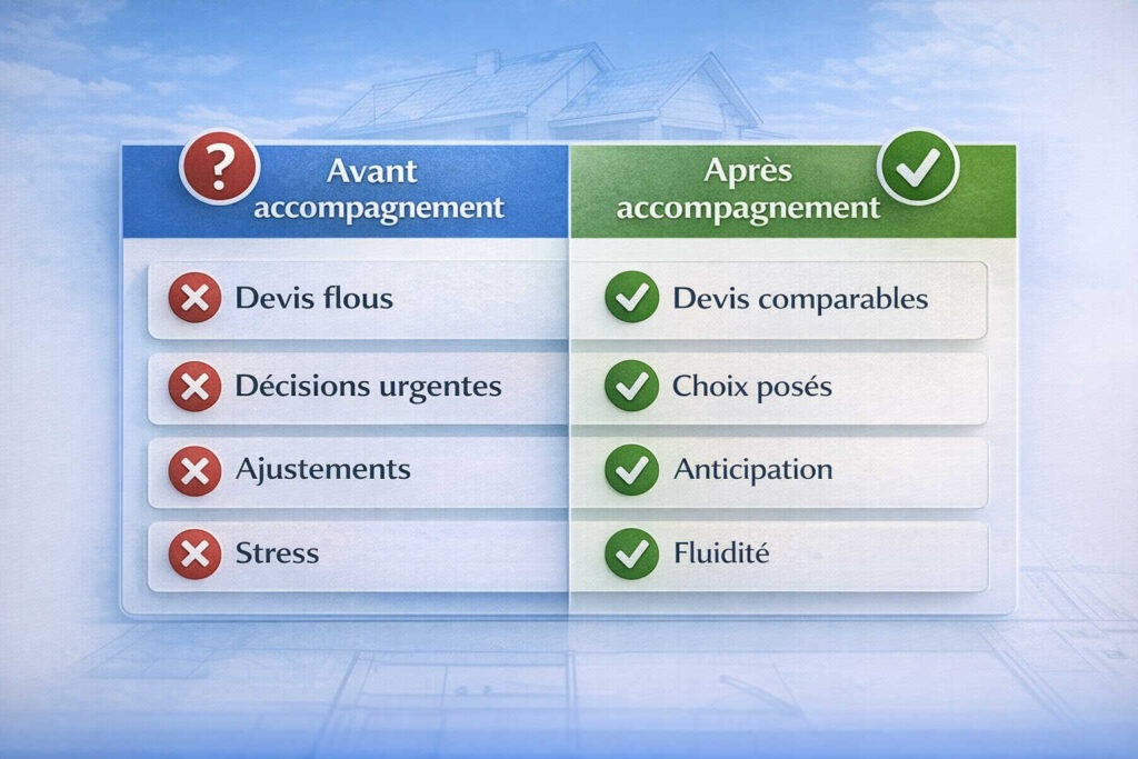 Oui, c’est possible, mais ce n’est plus le moment le plus simple pour structurer le projet. À ce stade, les devis reposent souvent sur des hypothèses différentes, ce qui oblige à reprendre certaines bases : périmètre, choix techniques ou niveau de finition. L’accompagnement reste utile, mais il sert davantage à recadrer qu’à construire le projet dans les meilleures conditions.