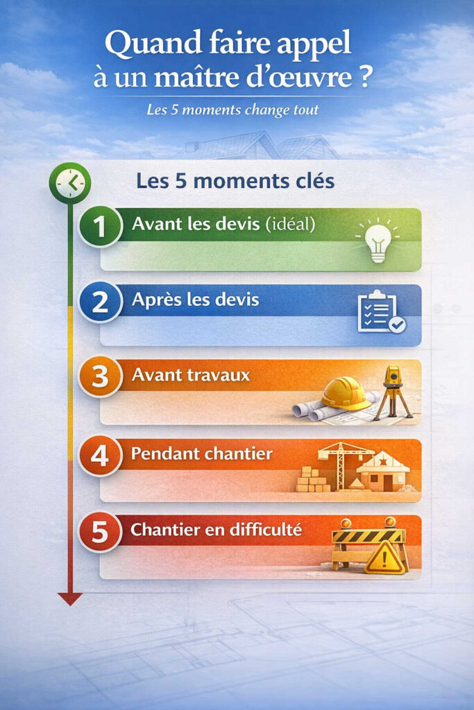 Autrement dit : plus votre rénovation demande de décisions, de coordination et d’anticipation, plus le bon moment pour vous faire accompagner compte.