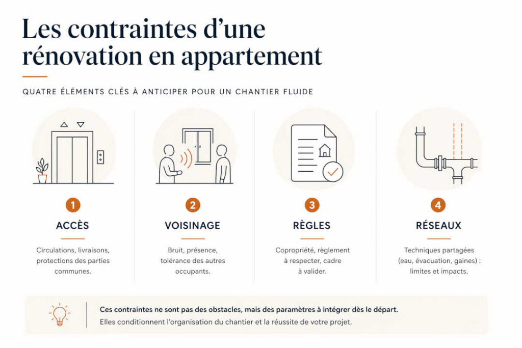 En appartement, ces éléments ne restent pas théoriques. Ils influencent directement la manière dont les travaux vont s’organiser.
